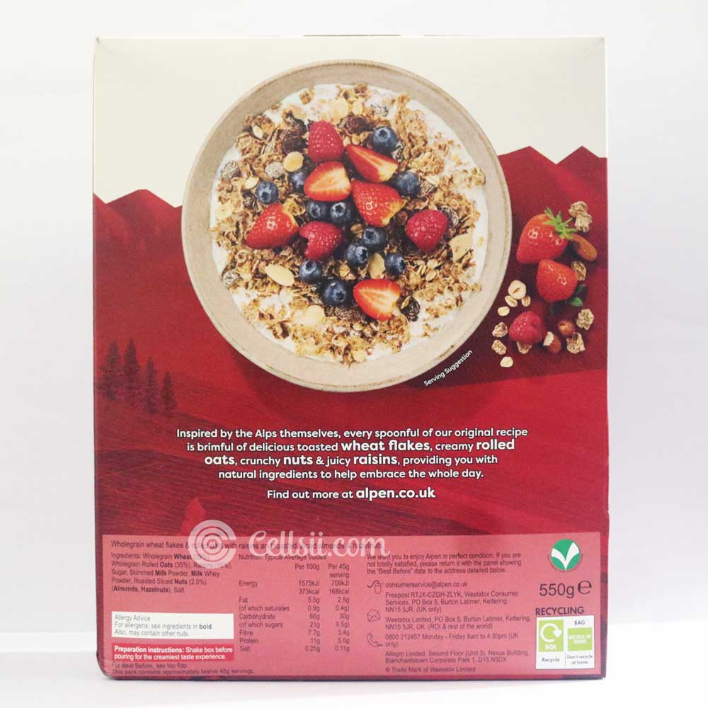 Buy Alpen Original Recipe Naturally Wholesome Muesli 550g online home delivery in Bangladesh from Cellsii.com. This bowl of Swiss muesli is cram packed with an abundance of delicious ingredients. Juicy raisins to help provide fibre, crunchy nuts, creamy rolled oats and wholegrain wheat flakes that help provide energy to start your day the right way.