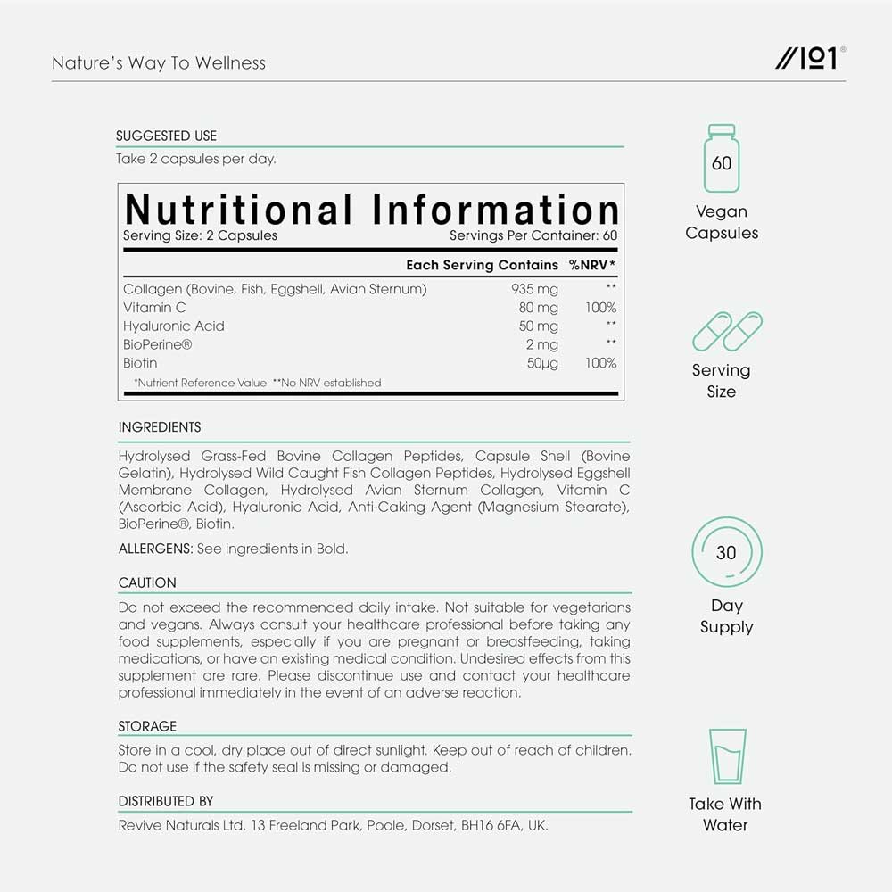 - Our multi-collagen capsules have been enriched with hyaluronic acid, a naturally-occurring hydration molecule, biotin, a beauty-boosting vitamin that supports the health and appearance of the skin and hair, and BioPerine for maximum absorption and utilisation.