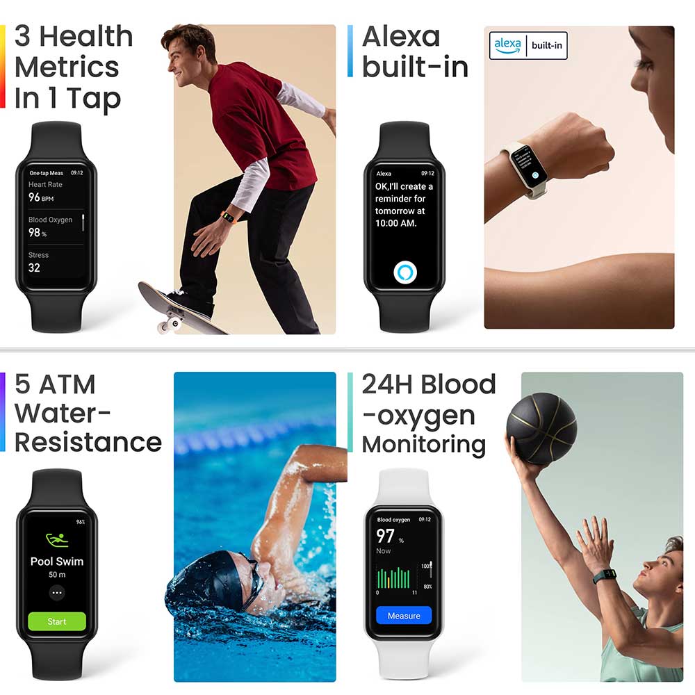 - Amazfit Band 7 has Amazon Alexa built-in, so you can easily set an alarm, get a translation and more to make every day easier. Light and low power-consuming Zepp OS enable supreme & seamless interaction, and the rich app ecosystem features over 10 mini apps to enhance your daily life.