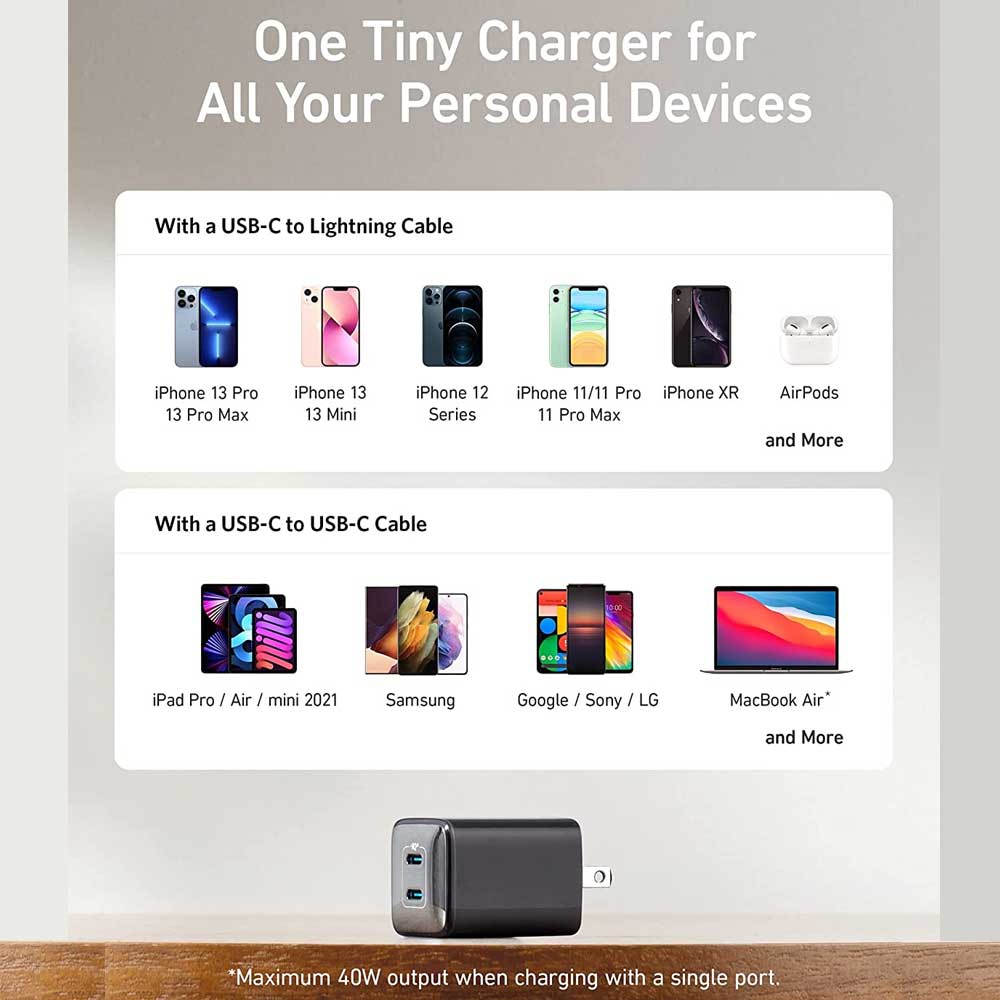 Buy Anker 521 Nano Pro USB C Charger 40W online from Cellsii.com. Anker 521 Nano Pro not just a phone charger with 2 ports and 40W of power, Anker 521 Charger is ideal for charging your new iPhone, your iPad, your AirPods, and your macBook Air. Power at Your Fingertips Charge at up to 40W from a charger that's smaller than your AirPods Pro. High-Speed Charging Connect to a single port to give your macBook Air a high-speed charge.