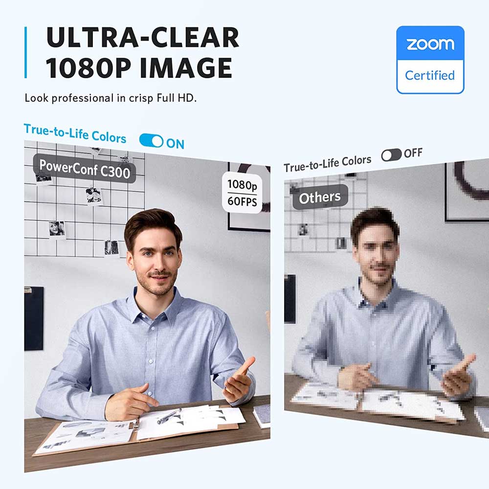 - Upgrade your grainy laptop camera and look like a true professional with PowerConf C300’s full HD 1080p/60fps camera.