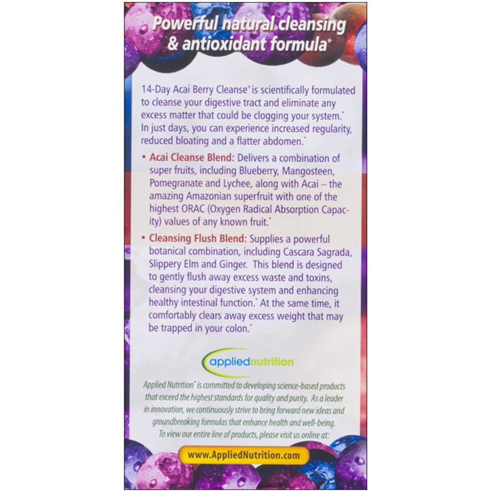 Buy Applied Nutrition 14 Day Acai Berry Cleanse Tablets 56 Count online from Cellsii.com. 14 Day Acai Berry Cleanse is scientifically formulated to cleanse your digestive tract and get rid of any excess matter that could be clogging your system. In just days, you can experience increased regularity, reduced bloating and a flatter abdomen.