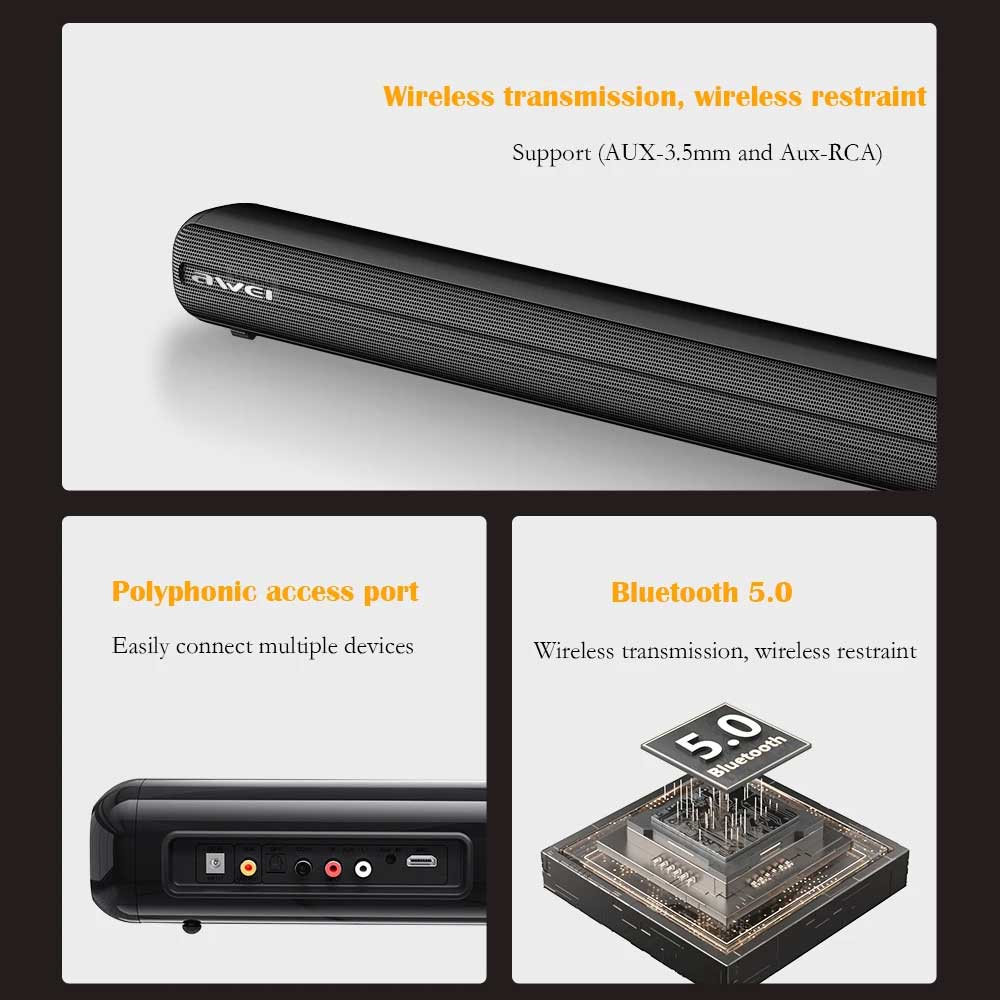 - Awei wireless surround bluetooth home TV speaker cinema level three dimensional shock listening. Wireless transmission, wireless restraint, support AUX 3.5mm & AUX-RCA. Polyphonic access port easily connect multiple devices. Bluetooth 5.0 wireless transmission, wireless restraint.