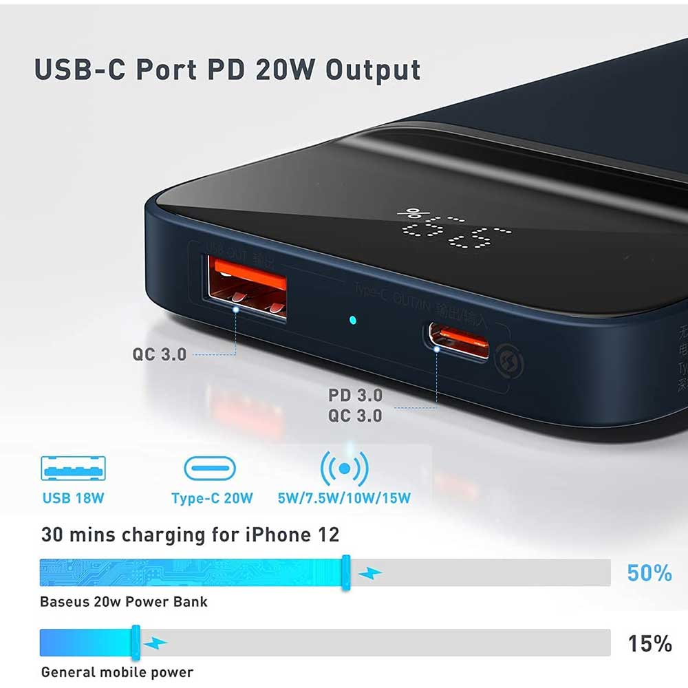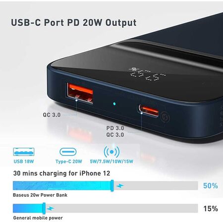 - LED display shows the battery percentage in real time, slightly concave screen coincides iPhone 12’s camera perfectly which protects your camera and makes the charging more stable.In addition to this power bank, you'll get one USB-A to USB-C cable.