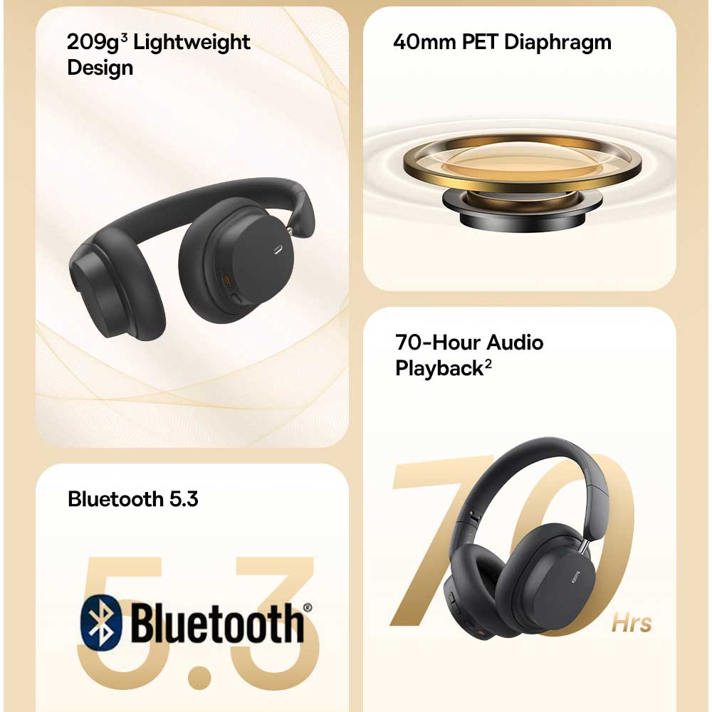 Buy Baseus Bowie D03 Over-Ear Bluetooth Headphone online from Cellsii. Baseus Immersive Spatial Acoustics, A wider sound stage lets you immerse in the world of digital visuals and audio Advanced Wireless 5.3. Upgraded BT 5.3 smart chip, both channels sync up individually and simultaneously, creating a strong and stable connection 70-Hour audio playback time. Equip with bigger batteries so you can enjoy your music anytime you want.