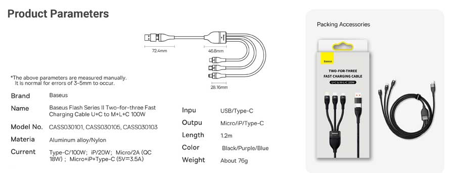 - Intensity: USB-C/100W; iP/20W; Micro USB/2A (QC 18W), Micro USB+iP+USB-C (5V 3.5A)