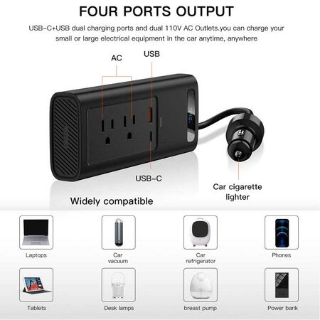 - High-end 150W car power inverter with 2 AC sockets, dual fast charging 4.5V/5A; 5V/4.5A; 5V/3A; 9V/2A; 12V/1.5A USB port and 1 Type -C 5V/3A; 9V/2A; 12V/1.5A, DC cigarette lighter socket, 40 cm cable is enough for you to use anywhere in the car.