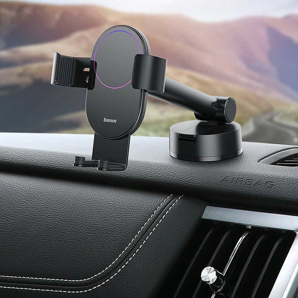 Buy Baseus Simplism Gravity Car Mount Holder with Suction Base online from Cellsii.com. The clamping arm can be adjusted flexibly suitable for Apple/Android phones. Retractable design easy to operate the extended telescopic arms can be adjusted freely with one hand. High-gloss mirror oretty and stylish piano mirror back plate and colorful ring light beautiful and high-quality smooth and scratch-resistant. Gravity linkage automatic locking with the help of the gravity of phones, clamping arms automatically retract and lock One-hand operation, stable clamping.