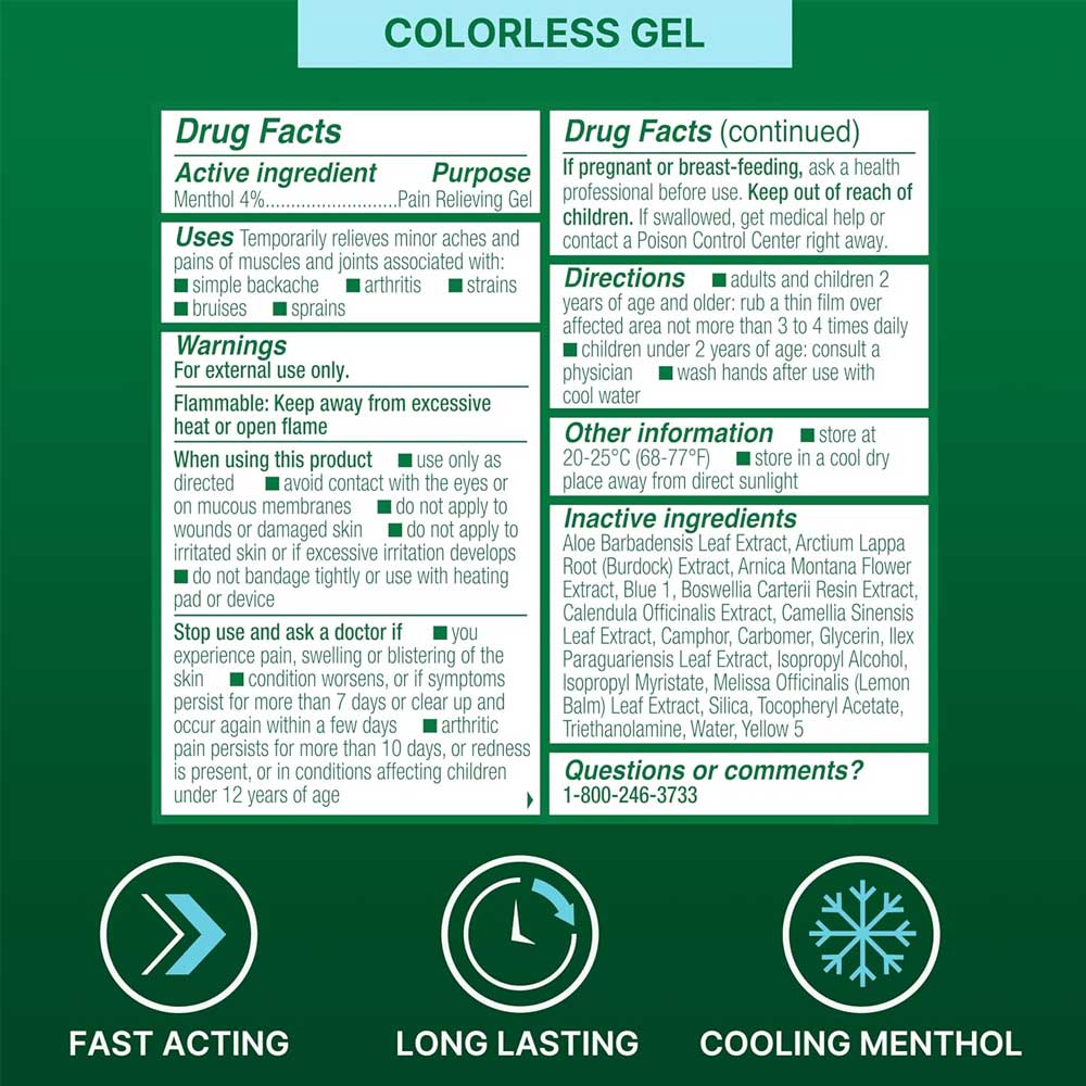 - Fast-Acting Pain Relief: Provides immediate cooling and pain relief upon application, helping to soothe muscle aches, joint discomfort, and arthritis pain.