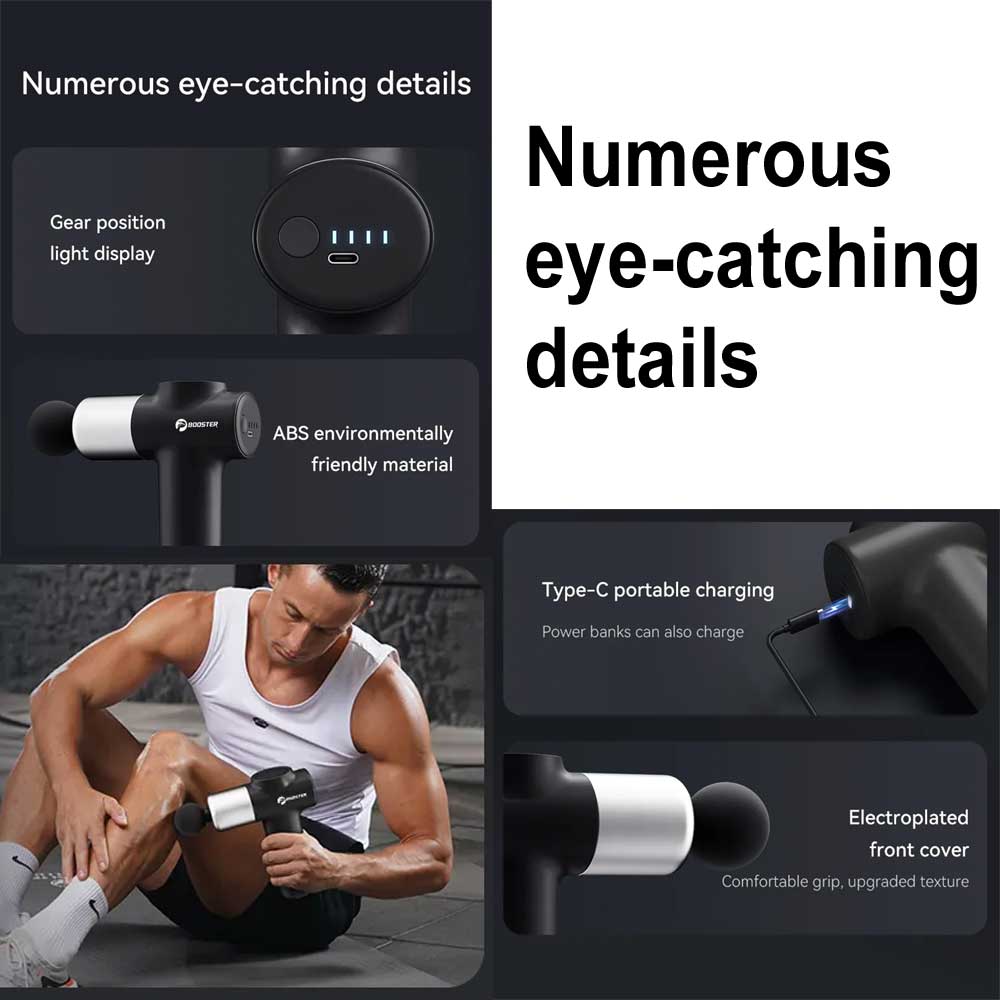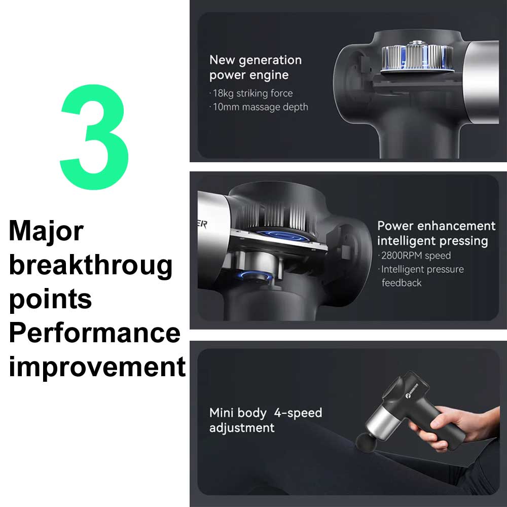 - High-Performance Brushless Motor: Delivers powerful percussive massage with low noise operation. High torque motor ensures deep muscle penetration, enhancing recovery and relaxation.