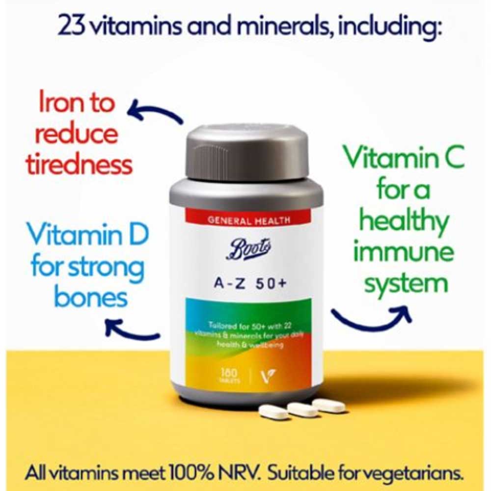 Buy Boots A-Z 50+ Vitamins & Minerals 180 Tablets online from Cellsii.com. Specially tailored for those age 50+, this formula offers a blend of 22 essential vitamins and minerals tailored to support your overall health and wellbeing.