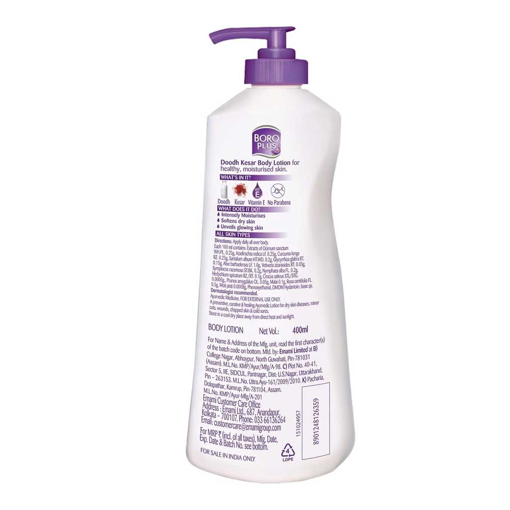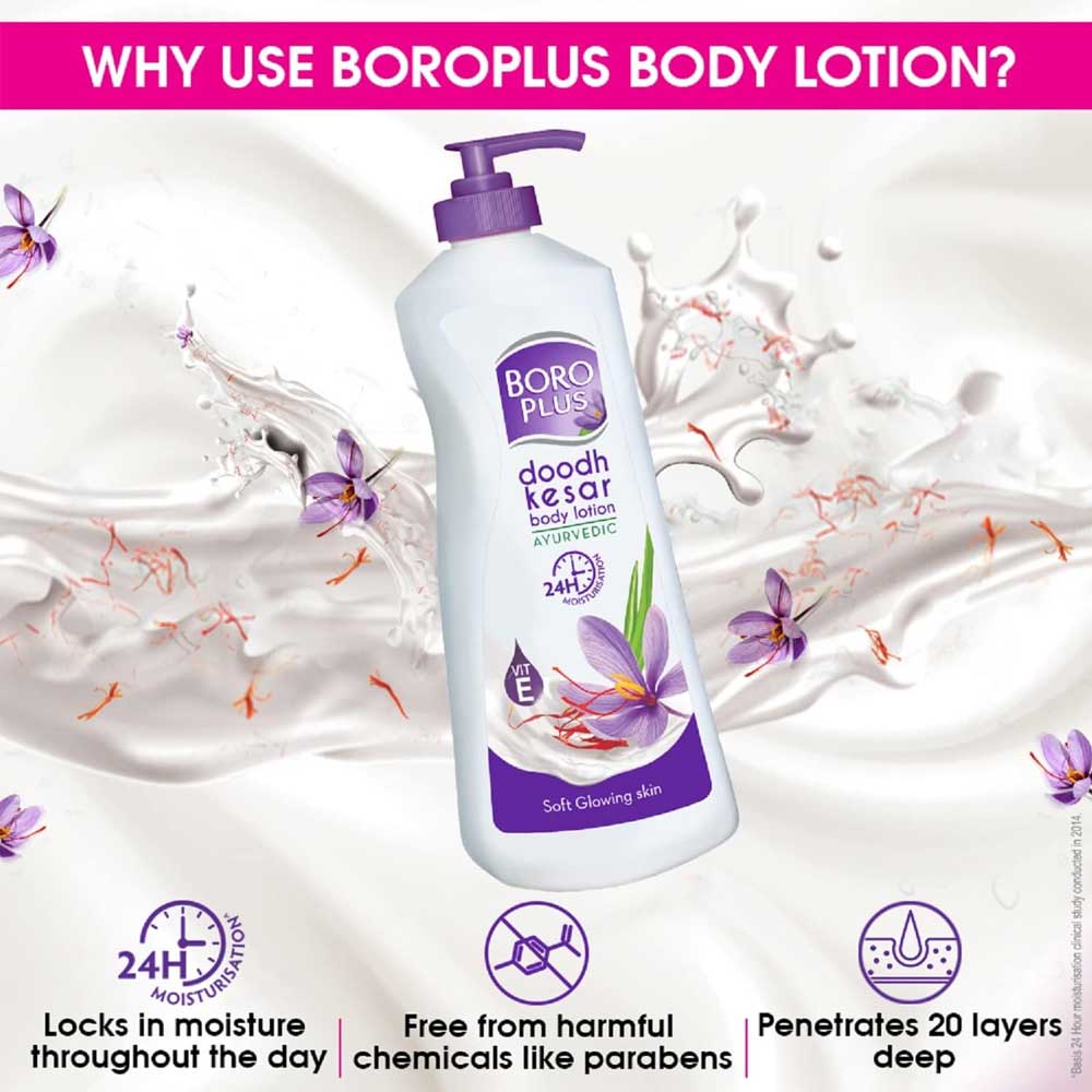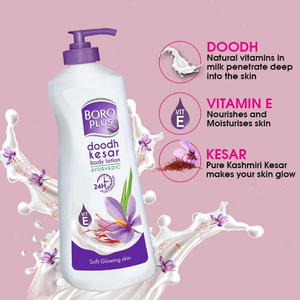 - Containing 100% natural ingredients and developed by skin experts following ayurvedic procedures, BoroPlus Doodh Kesar Body Lotion is kind to skin because of the absence of harsh chemicals.