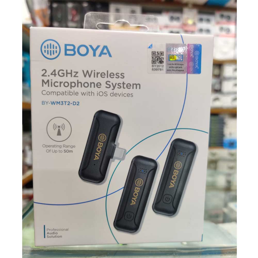 Buy Boya BY-WM3T2 Mini 2.4GHz Wireless Lavalier Microphone online in Bangladesh from Cellsii.com at best price. BY-WM3T2 series is a mini 2.4GHz wireless microphone system that provides high-quality sound for live streaming, vlogging, course recording, and other audio capturing app lications.With an MFi Certified Lightning output, the BY-WM3T2-D2 is designed for Apple iOS devices. Including the 2 transmitters, it can record two sound sources at the same time.