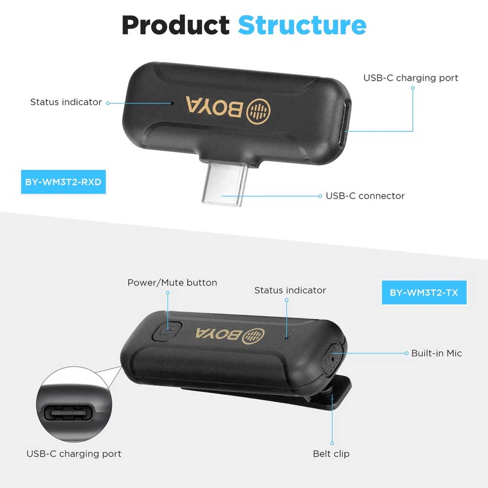 Buy Boya BY-WM3T2-U1 Professional Wireless Lavalier Microphone online in Bangladesh from Cellsii.com at best price. BY-WM3T2 series is a mini 2.4Ghz wireless microphone system that provides high quality sound for live streaming , vlogging, course recording, and other audio capturing app lications.BY-WM3T2-U1 is compatible with most Android devices with USB-C ports, including smartphones and tablets. It has 1 transmitter and 1 receiver.