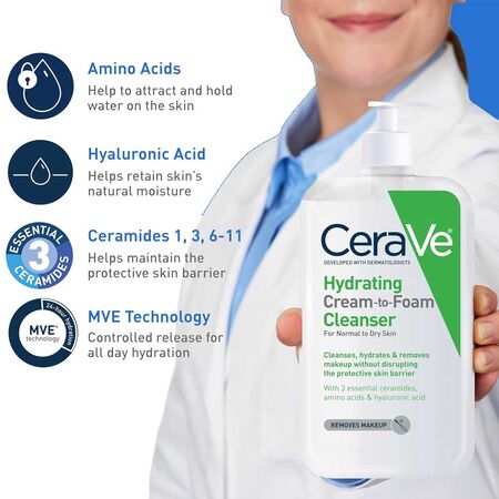Buy CeraVe Hydrating Cream to Foam Cleanser Normal to Dry Skin 355ml online in Bangladesh from Cellsii.com at best price. This Cleanser is the one step foaming cream cleanser your dry skin craves. CeraVe Hydrating Cream-to-Foam Cleanser is a rich cream that transforms into a lathering foam to gently, yet efficiently cleanse and remove makeup, while hydrating without disrupting the protective skin barrier. Suitable for normal to dry skin.