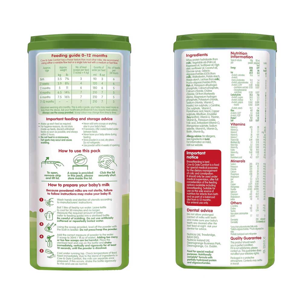 - Cow & Gate Comfort’s blend of ingredients, you may notice a change in your baby’s stool consistency (looser) and colour (greener).