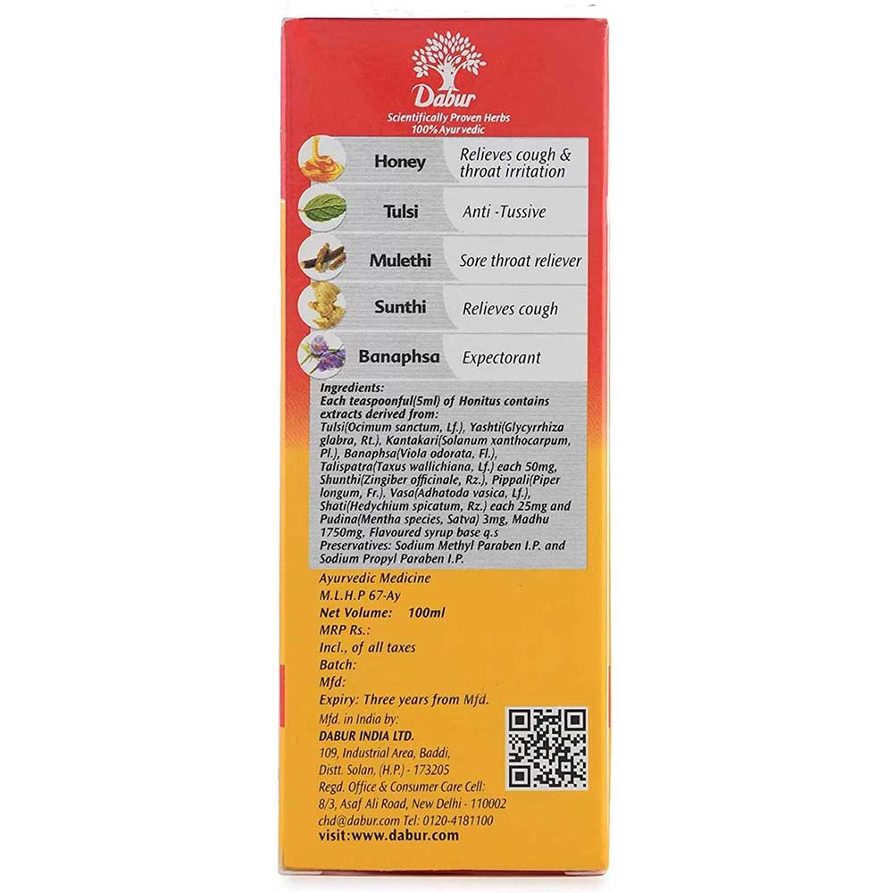Buy Dabur honitus cough remedy ayurvedic syrup 100ml online from Cellsii.com. Dabur's Honitus Cough Syrup provides effective relief from cough, without side-effects. Dabur Honitus Cough Syrup is an ayurvedic medicine for cough that is fortified with Tulsi , Mulethi & Banapsha and other powerful scientifically proven medicinal plants as recommended by ayurveda in India. It is 100% Ayurvedic and safe.
