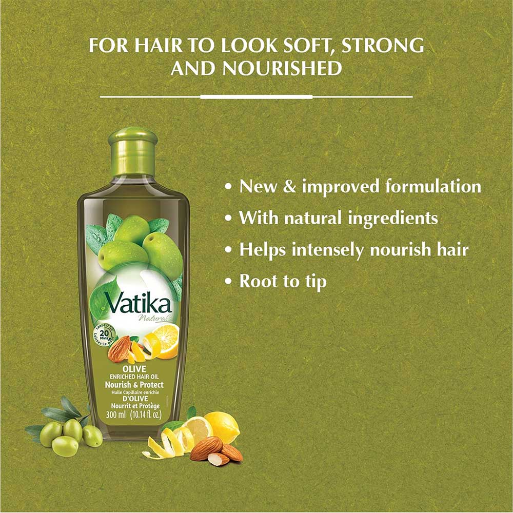 Buy Dabur Vatika Olive Enriched Hair Oil 300ml online from cellsii.com. Dabur Vatika Olive Enriched Hair Oil contains Virgin Olive Oil and nourishing extracts of almonds, Cactus & Lemon. Vatika's unique formulation ensures deeper oil penetration to give your hair and scalp complete natural nourishment for problem free, beautiful hair.