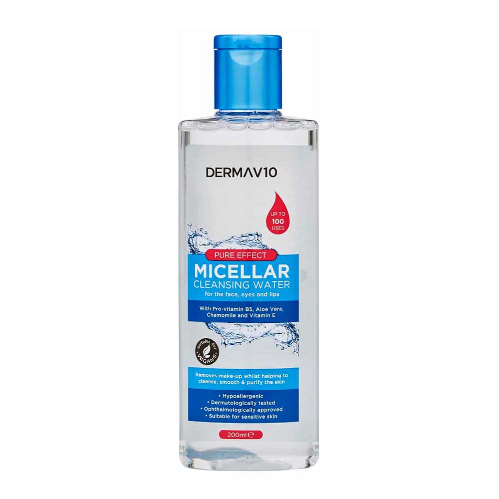 - Derma V10 Micellar Cleansing Water gently cleanses without any harsh detergents or chemicals, and leaves skin feeling soft, nourished and hydrated.