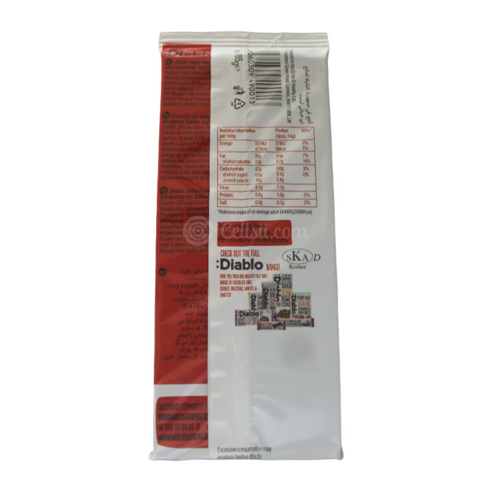 Buy Diablo Sugar Free Dark Chocolate with Sweetener 85g online in Bangladesh from Cellsii. Diablo Sugar Free Dark Chocolate with Sweetener is a decadent treat designed for those who want to enjoy the rich taste of dark chocolate without the added sugar. Made with high-quality cocoa and natural sweeteners, this bar offers the classic bitterness of dark chocolate with a guilt-free indulgence.