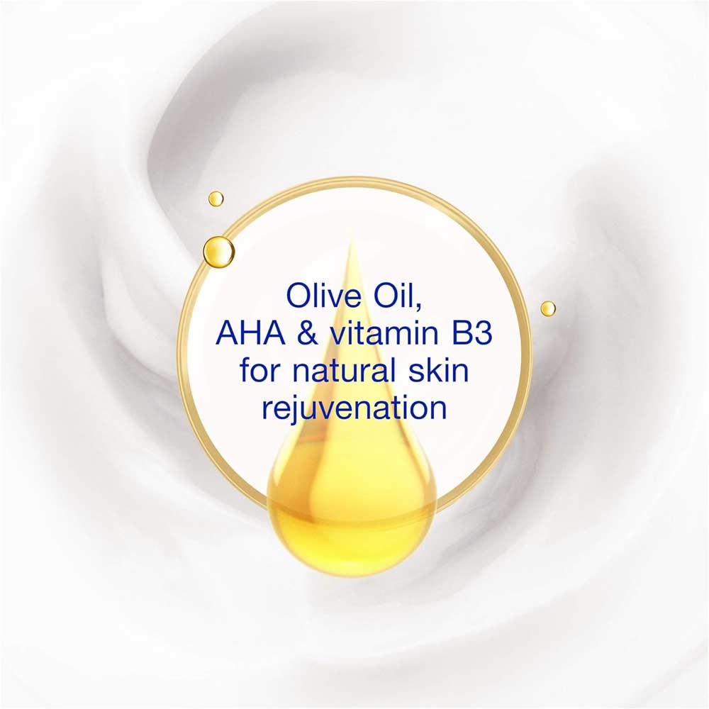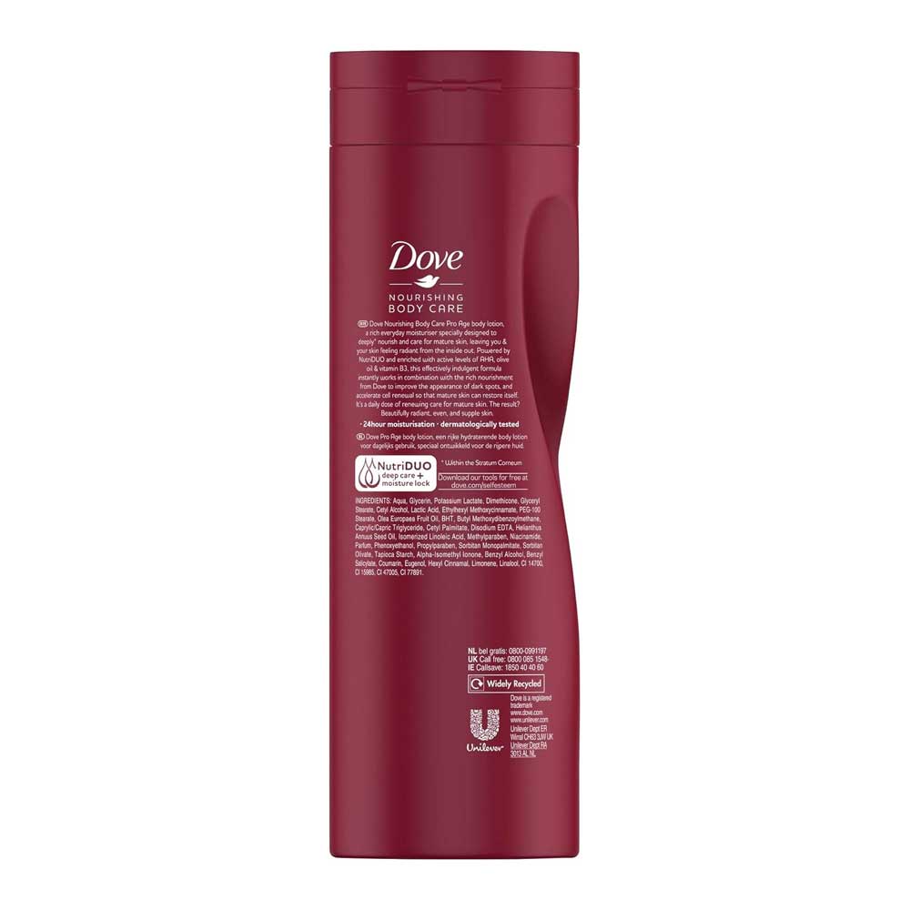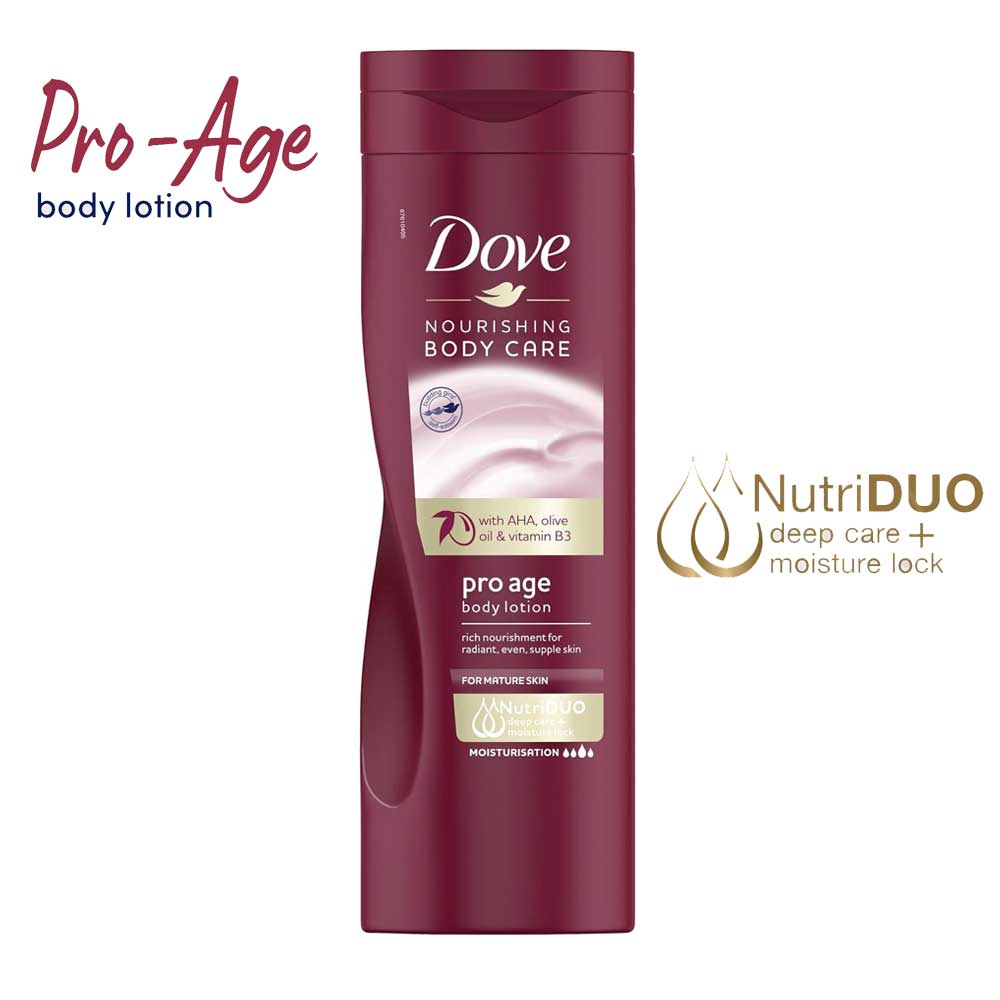 - Dove Pro Age Nourishing Body Care body Lotion contains AHA, olive oil and vitamin B3 for natural skin rejuvenation.