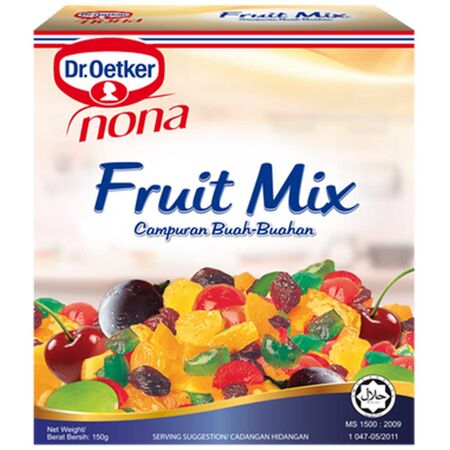 Buy Dr. Oetker Nona fruit mix 150g online in Bangladesh from Cellsii.com. Get an amazing fruity taste in your baked goods with the Dr. Oetker Nona fruit mix. This ready-prepared combination of orange peel, lemon peel, sultanas, raisins and cherry bits offer an interesting zing with dash of sweetness, and is a convenient addition for a delicious fruit cake, muffin, bread or cookie recipes.