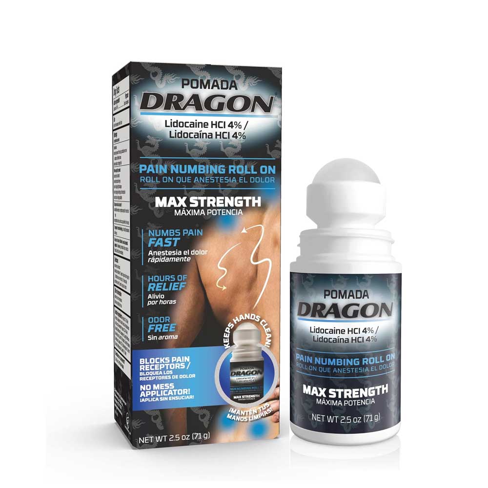 Buy Dragon Pomada Max Strength Pain Numbing Roll On 71g online from Cellsii.com. Dragon maximum strength pain numbing roll-On contains 4% Lidocaine, the maximum strength without a prescription. Its numbing pain formula relieves the pain in the upper back & shoulder, knees, elbows, wrists, foot & ankles, and legs.