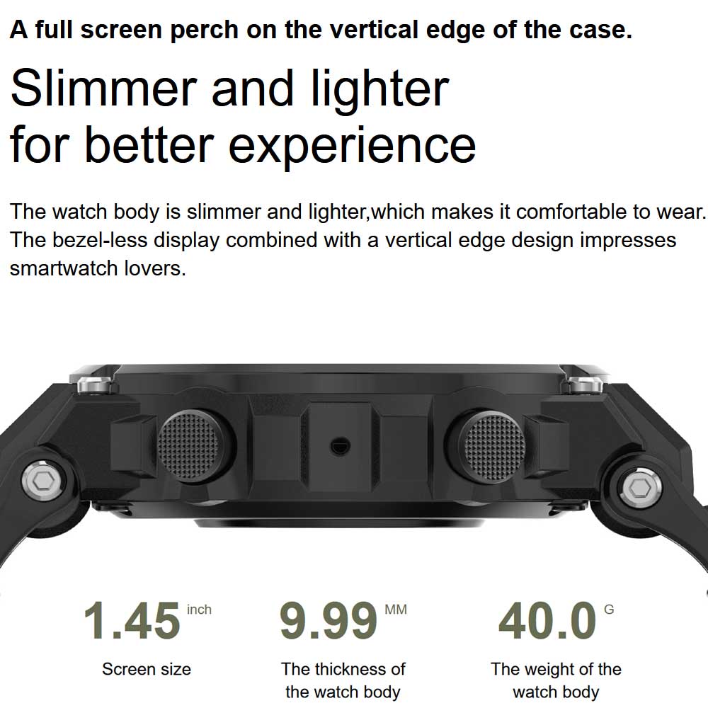 - The watch body is slimmer and lighter,which makes it comfortable to wear. The bezel-less display combined with a vertical edge design impresses smartwatch lovers.