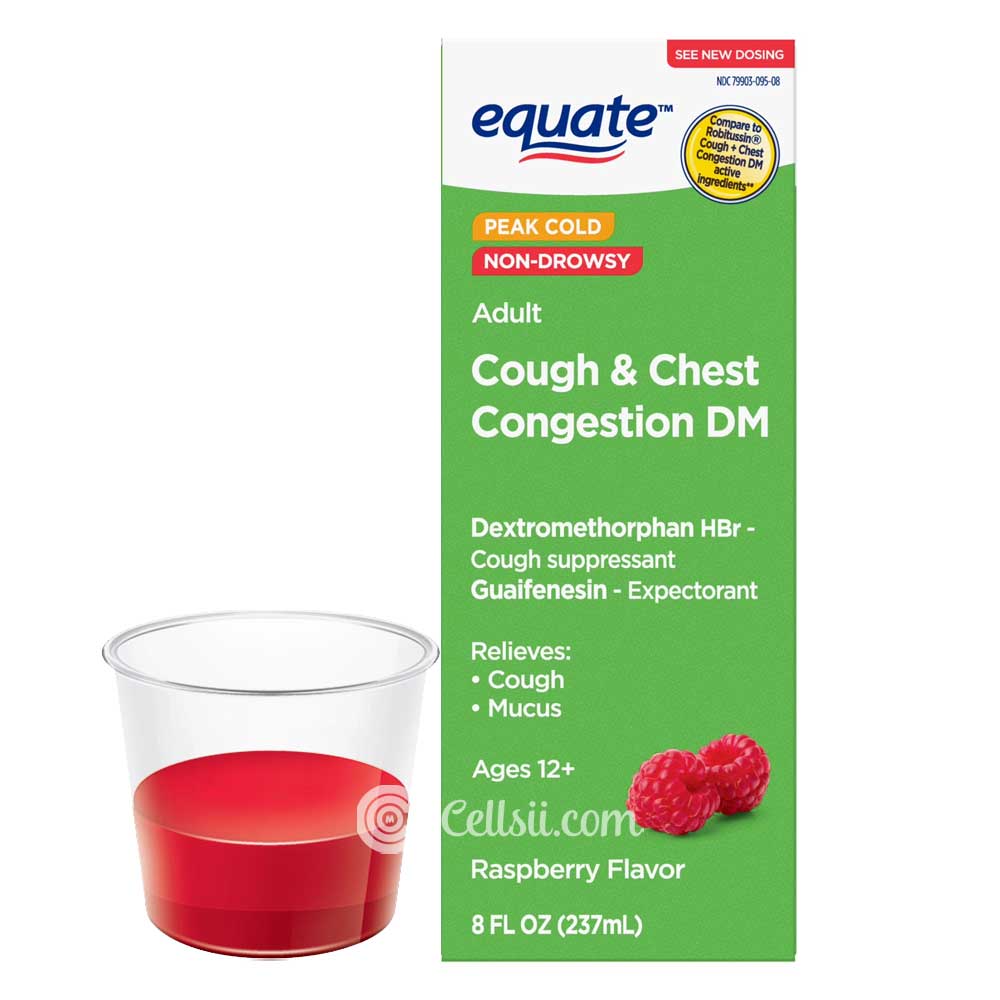 - Equate Tussin DM is a cough syrup for adults that combines the cough suppressant Dextromethorphan HBr with the expectorant Guaifenesin to relieve chest congestion and cough due to minor throat and bronchial irritation.