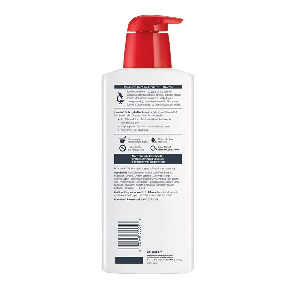 - Eucerin Daily Hydration fragrance free body lotion is enriched with Sunflower Oil & Pro-Vitamin B5 that moisturizes to help protect and heal dry skin.