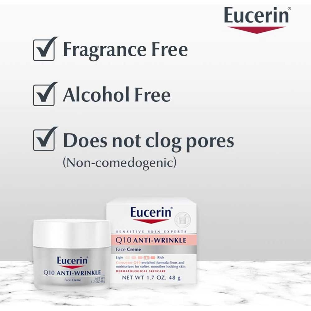 - Free Of: Eucerin Q10 face cream for wrinkles is fragrance, alcohol and dye free, and can be used alone or under make-up.