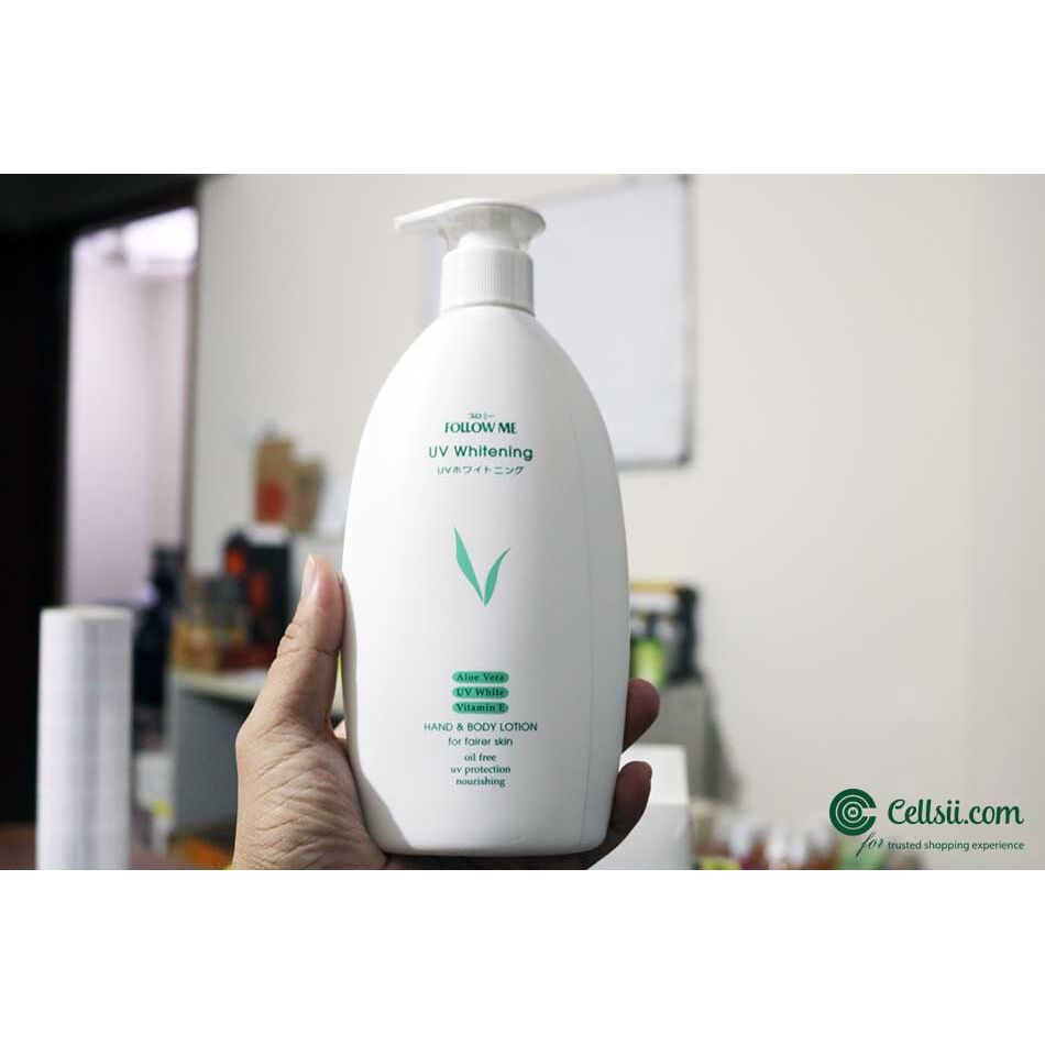 Buy Follow Me UV whitening hand and body lotion 400ml online from Cellsii.com. Made with natural plant extracts and Aloe vera, this unique hydrating lotion is a rich source of vitamin E, known for its skin conditioning and antioxidant properties help to restore the skin's optimum moisture balance.
