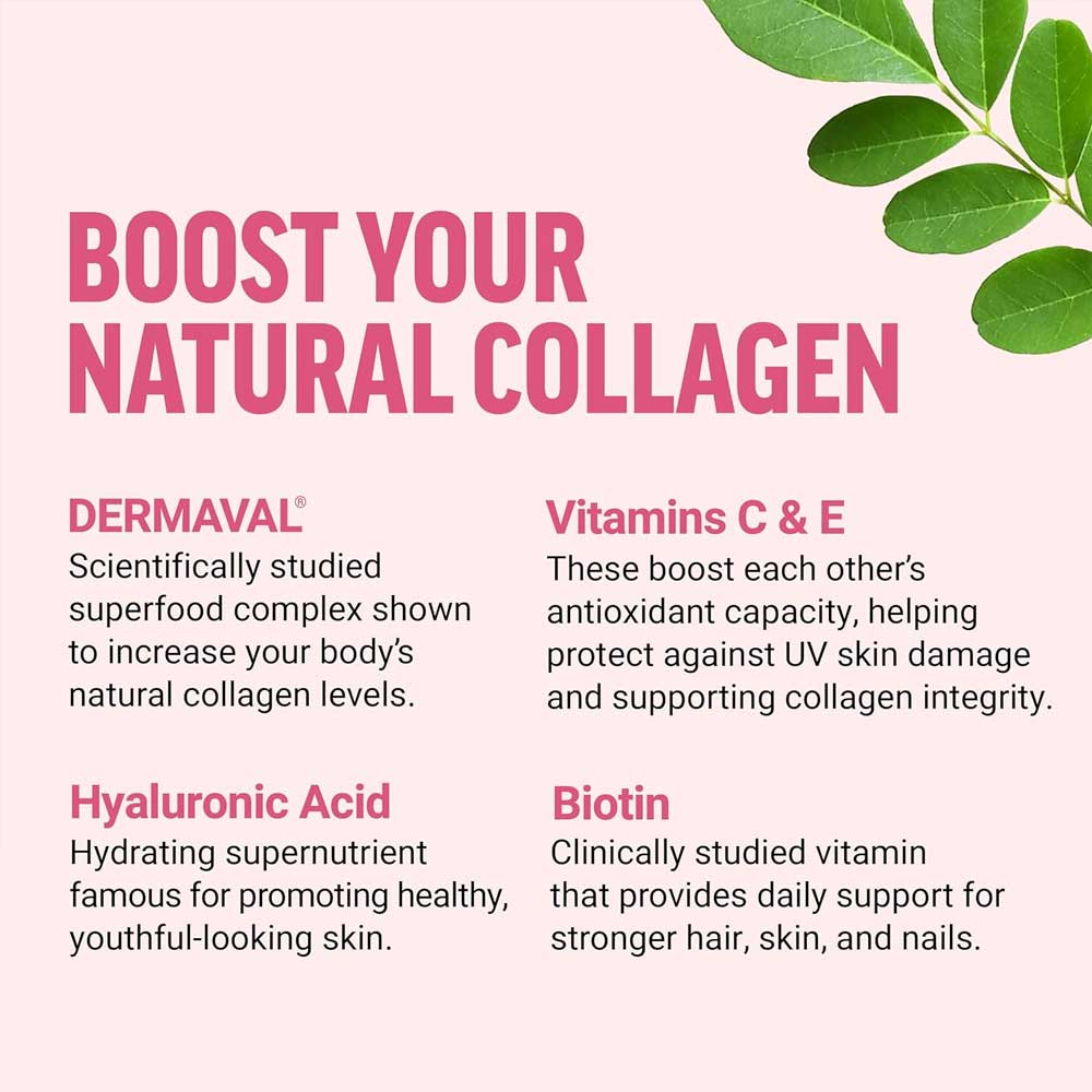 - Unlike most collagen supplements, this powerful collagen-boosting formula contains Dermaval, a superfood complex clinically studied to boost your body’s natural collagen production for healthier skin.