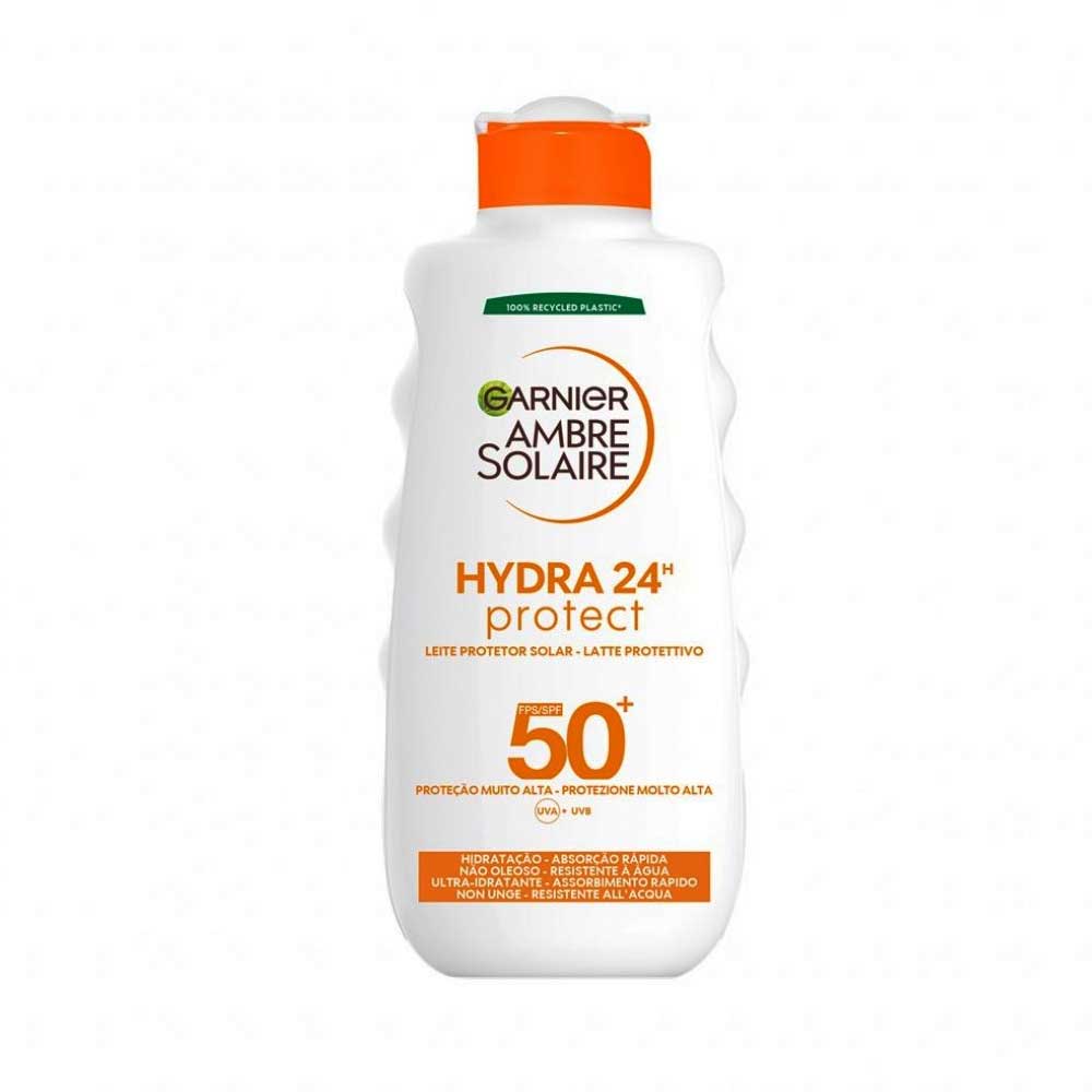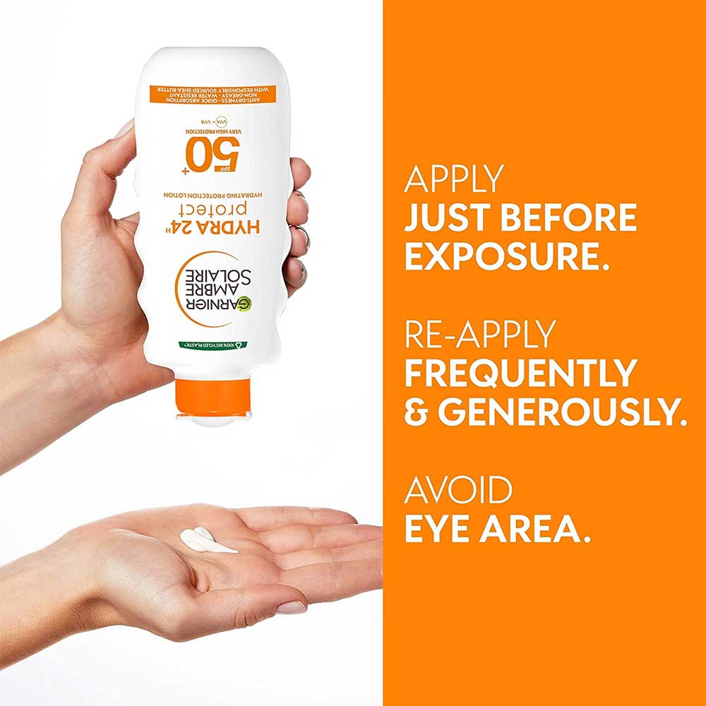 - Garnier Ambre Solaire Hydra 24 Hour Protect Sun Protection Lotion SPF 50+ provides advanced UVA and UVB protection against sun induced skin damage and sunburn.