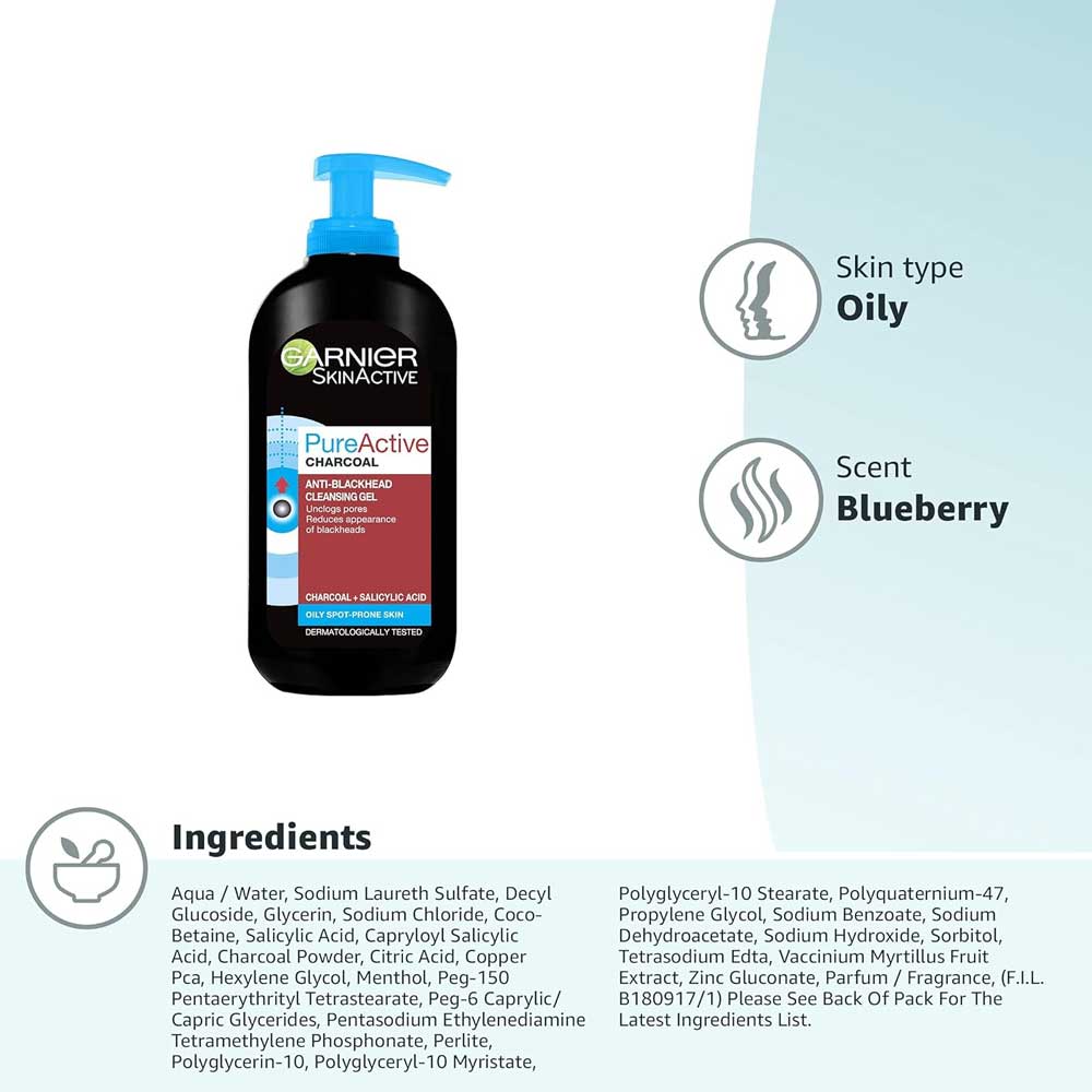 - Garnier Pure Active Intensive Anti-Blackhead Charcoal Gel Wash daily cleanser for problem skin.