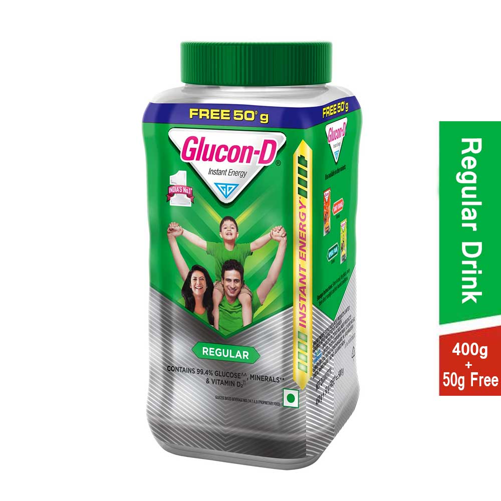 Buy Glucon D Instant Energy Health Drink Regular Jar 450g online from Cellsii.com. Glucon D helps you stay active as it gives you an instant energy boost. The Glucon D powder contains Minerals, Vitamin C, Phosphorus and Calcium that replenish glucose level in your body and refreshes you. Glucon D benefits don’t end here; this glucose enriched drink helps you fight fatigue, keeps you mentally alert and charged.