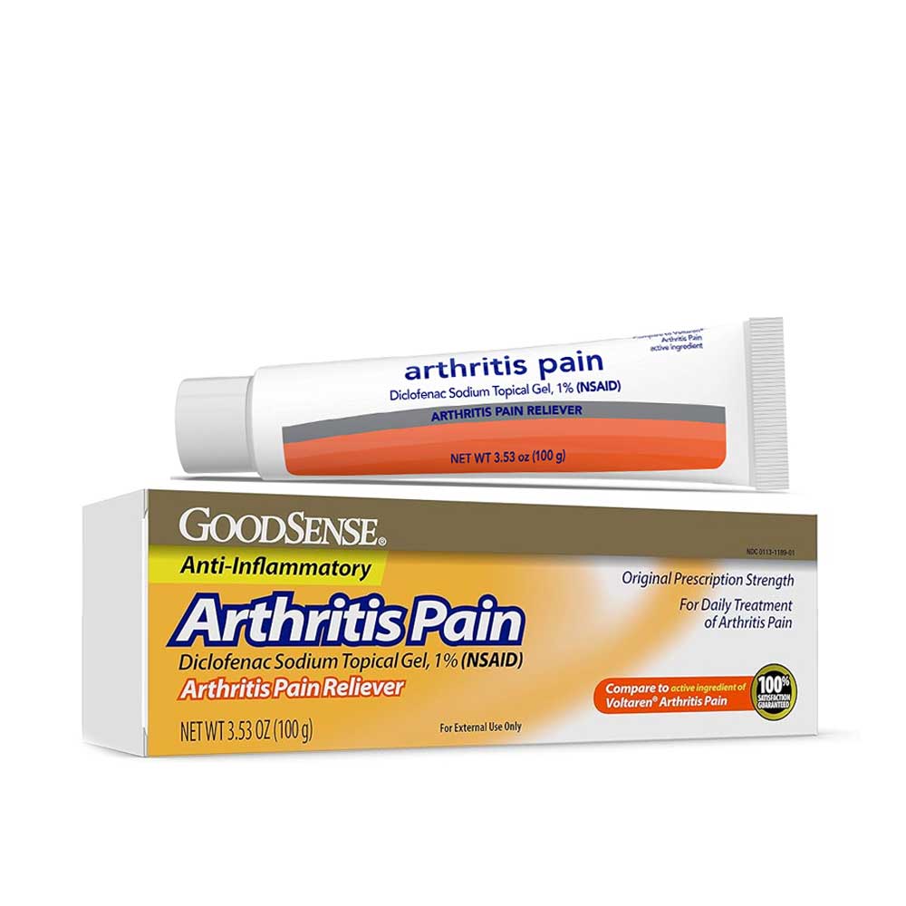 - GoodSense Arthritis Pain Relieving Gel contains an NSAID (non-steroidal anti-inflammatory drug) to help relieve hand, wrist, elbow, foot, ankle and knee arthritis pain.