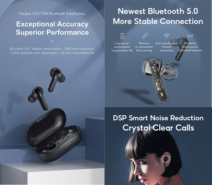 - DSP smart noise reduction crystal clear calls: Haylou GT3 has built-in DSP smart noise reduction technology to accurately capture human voices, greatly improving the quality of calls. Enjoy clear calls even in noisy environment.