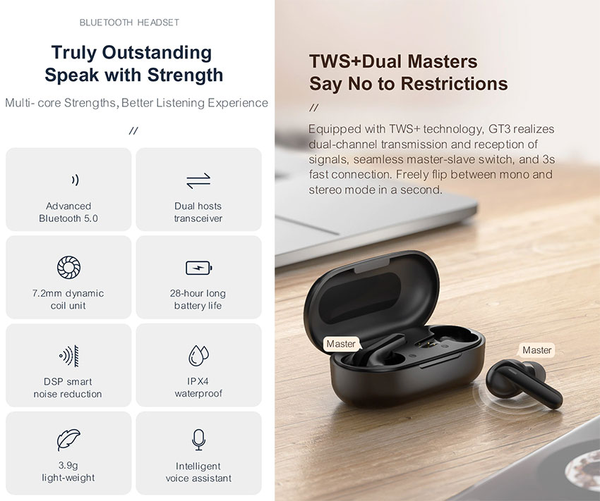 Buy Haylou GT3 TWS HD Call Bluetooth earphones online from Cellsii.com. Haylou GT3 equipped with TWS+ technology, GT3 realizes dual-channel transmission and reception of signals, seamless master-slave switch, and 3s fast connection. Freely flip between mono and stereo mode in a second. Haylou GT3 has built-in DSP smart noise reduction technology.