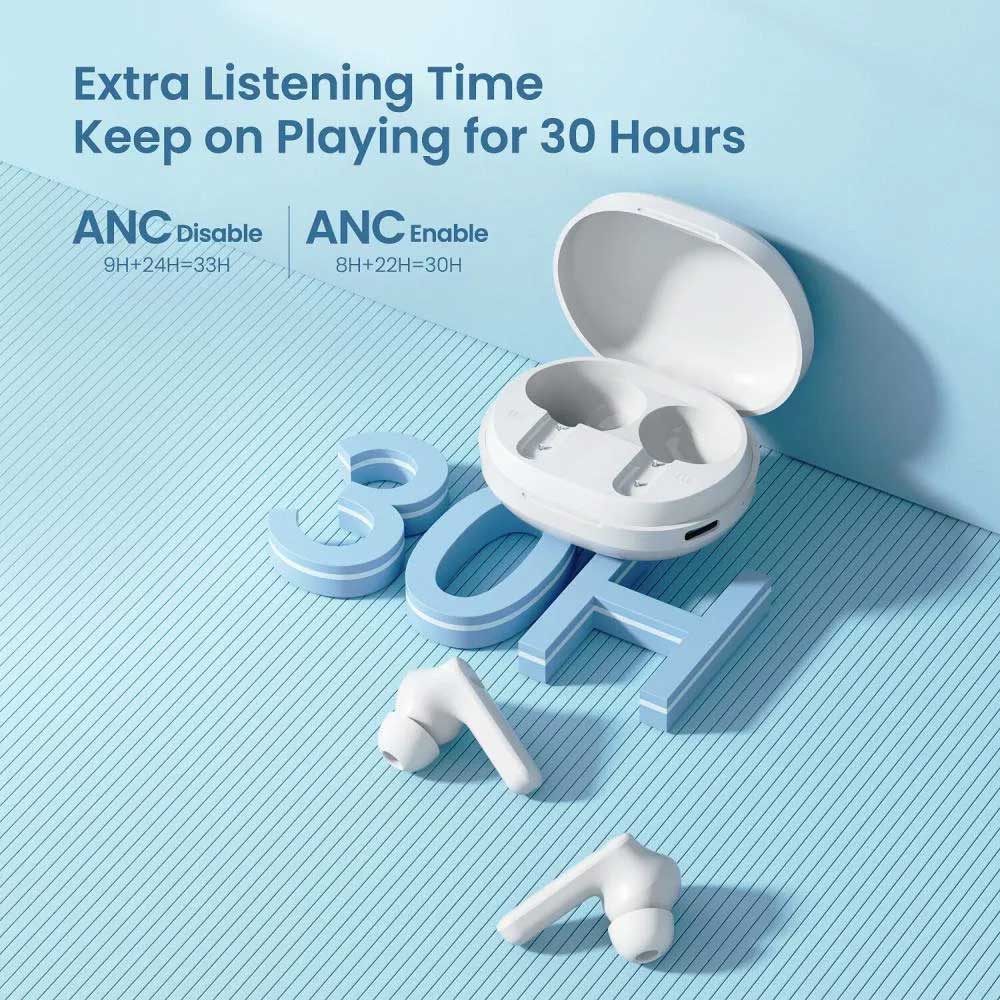 - Extra Listening Time: With ANC mode on, you can still have up to 30 hours of playtime, getting you through your longest days. ANC Disable 9H+24H=33H; ANC Enable 8H+22H=30H
