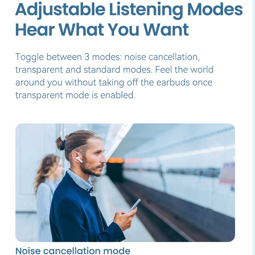 - Adjustable Listening Modes: Toggle between 3 modes: noise cancellation, transparent and standard modes. Feel the world around you without taking off the earbuds once transparent mode is enabled.