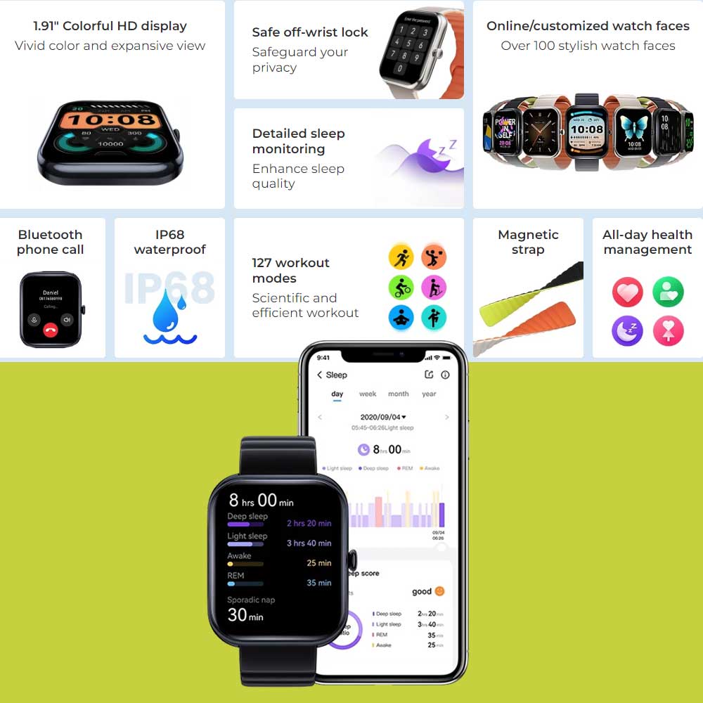 - Features a 1.78-inch HD AMOLED display with vibrant colors and sharp clarity, providing a visually pleasing user experience. The large screen makes it easy to navigate through apps, notifications, and health metrics.