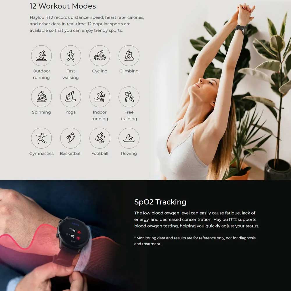 - The Haylou RT2 has 12 Workout Modes. So that it can record distance, speed, heart rate, calories, and other data in real-time. In addition, twelve popular sports are available so that you can enjoy trendy sports. The 12 Workout Modes are - Outdoor running, Fast walking, Cycling, Climbing, Spinning, Yoga, Indoor running, Free training, Gymnastics, Basketball, Football, and Rowing.