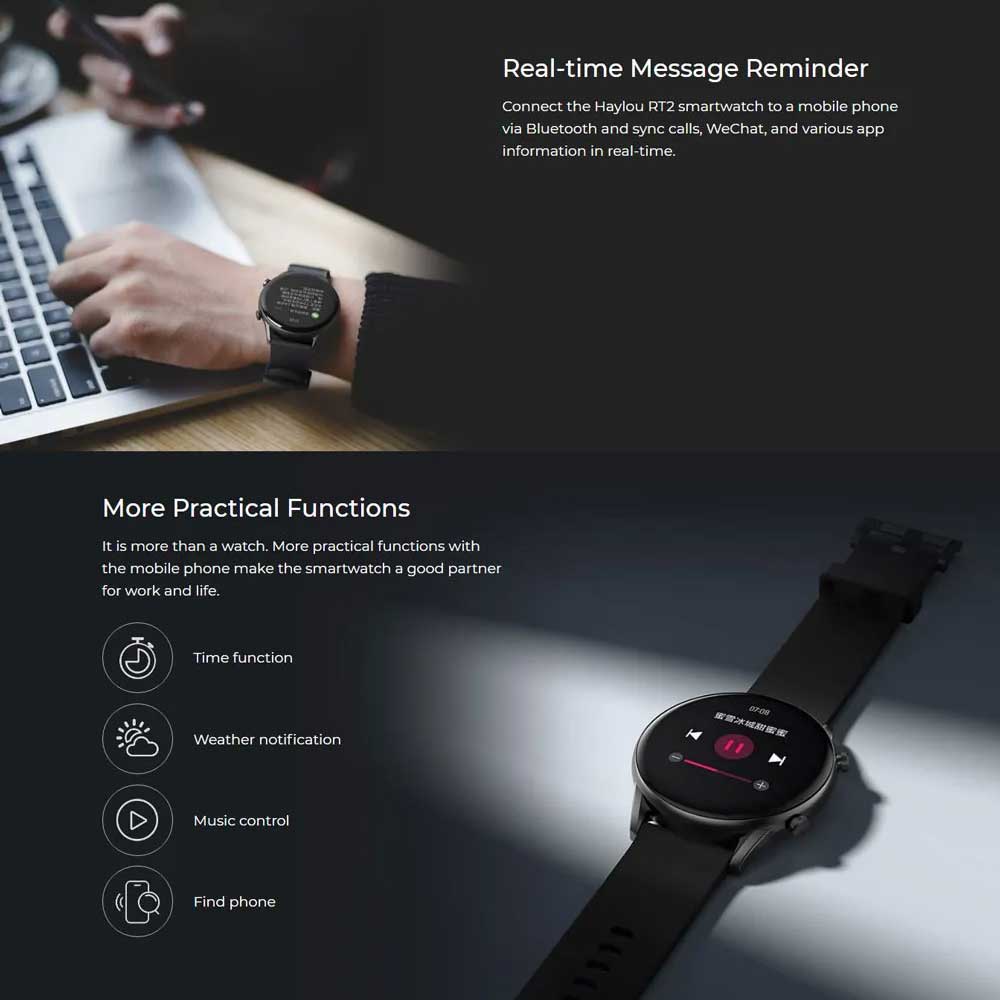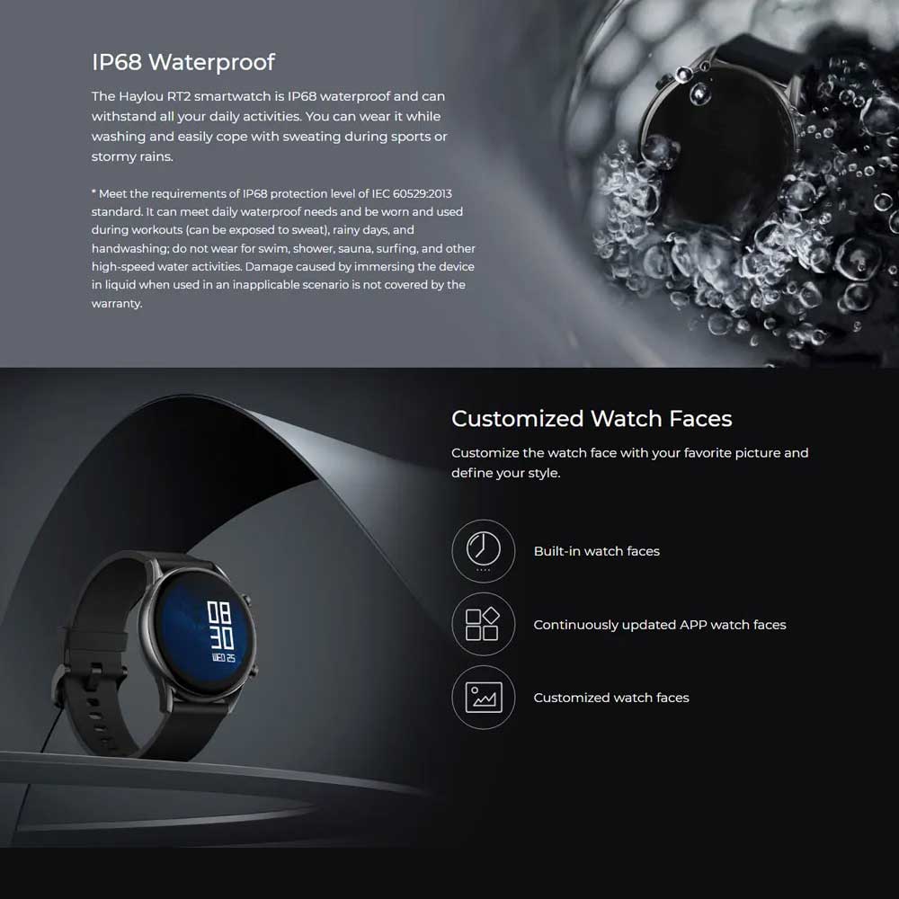 - The Haylou RT2 smartwatch comes with IP68 waterproof, and also you can withstand all your daily activities. For example, you can wear this Smartwatch while washing and easily cope with sweating during sports or stormy rains.