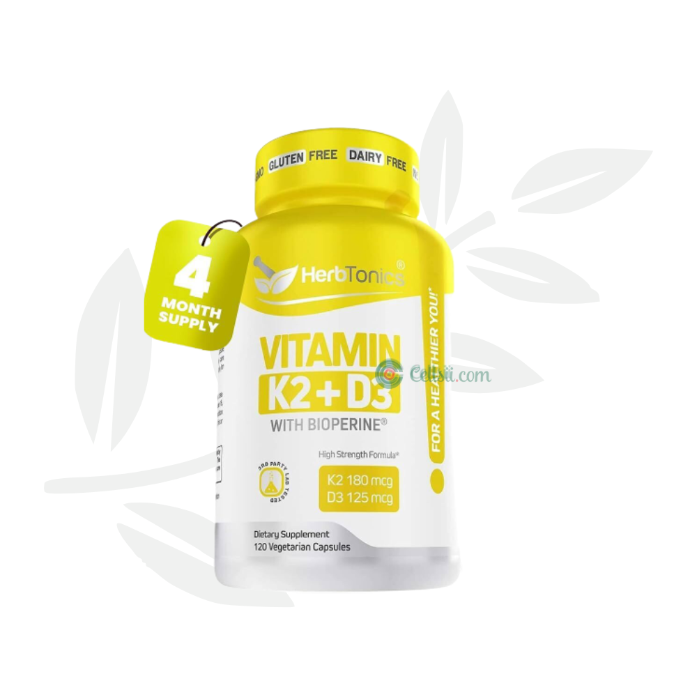 Buy Herbtonics Vitamin K2 + D3 online in Bangladesh from Cellsii.com at the best price and Strengthen your bones, boost your immune system, and support muscle function. Herbtonics Vitamin K2 + D3 is a high-potency supplement expertly formulated for optimal health. Each serving delivers 180 mcg of Vitamin K2 (as MK-7) and 125 mcg of Vitamin D3, enhanced with BioPerine for superior absorption and bioavailability.