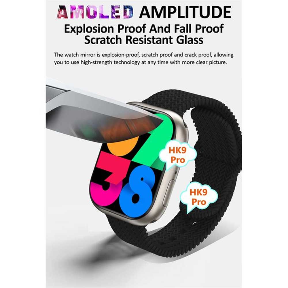 Buy HK9 Pro Amoled Smart Watch online from Cellsii. The design and 2.02-inch 2.5D curved display are exactly the same as on the Watch 8 previous the same curved chassis and thin screen edge curve precisely into the case, and It runs the same operating system and works with the same combination of the Crown button works for page-turning, zooming in/out, turning on-off, and back and is positioned above the right edge with a side button below it.