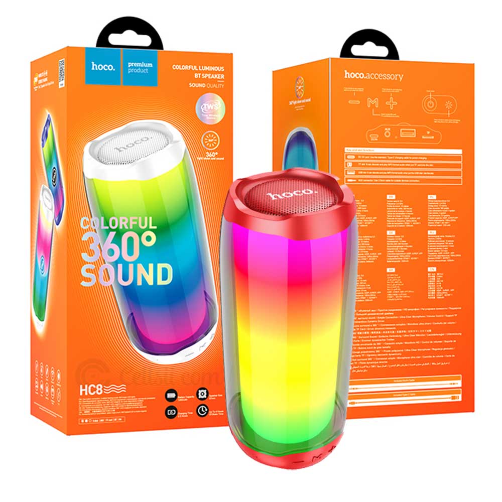 Buy Hoco HC8 Pulsating Colorful Luminous Bluetooth Speaker online from Cellsii.com. Hoco HC8 is an amazing colorful Bluetooth Speaker. It is supported Bluetooth, FM, TF card, U disk, TWS, AUX and other modes. It had come with 360° surround LED ambient light.