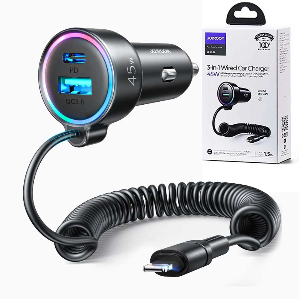 Buy Joyroom JR-CL08 Wired 3 in 1 Car Charger with Lightning Cable online from Cellsii.com. Joyroom JR-Cl08 USB-C wired car charger, 45W large power output, capable of charging for 3 devices simultaneously. Supported fast charge protocols include PD3.0, QC3.0, PPS, Samsung AFC. Extendable coiled cable design, Max length up to 1.5m, convenient for use without winding.