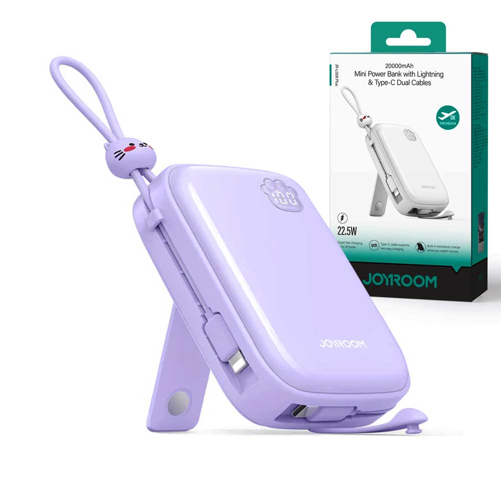 Buy Joyroom JR-L008 Plus 20000mAh Power Bank with Lightning & Type C Dual Cables online in Bangladesh from Cellsii. Joyroom JR-L008 Plus Cutie Series is the perfect combination of functionality and fashionable design. This 22.5W portable powerbank allows you to charge up to 3 devices simultaneously. The powerbank has USB-A, USB-C and Lightning connectors, making it compatible for quite a number of phone, tablet models. In addition, the JR-L008 Plus is equipped with a fold-out leg, so it can serve as a stand for your device.
