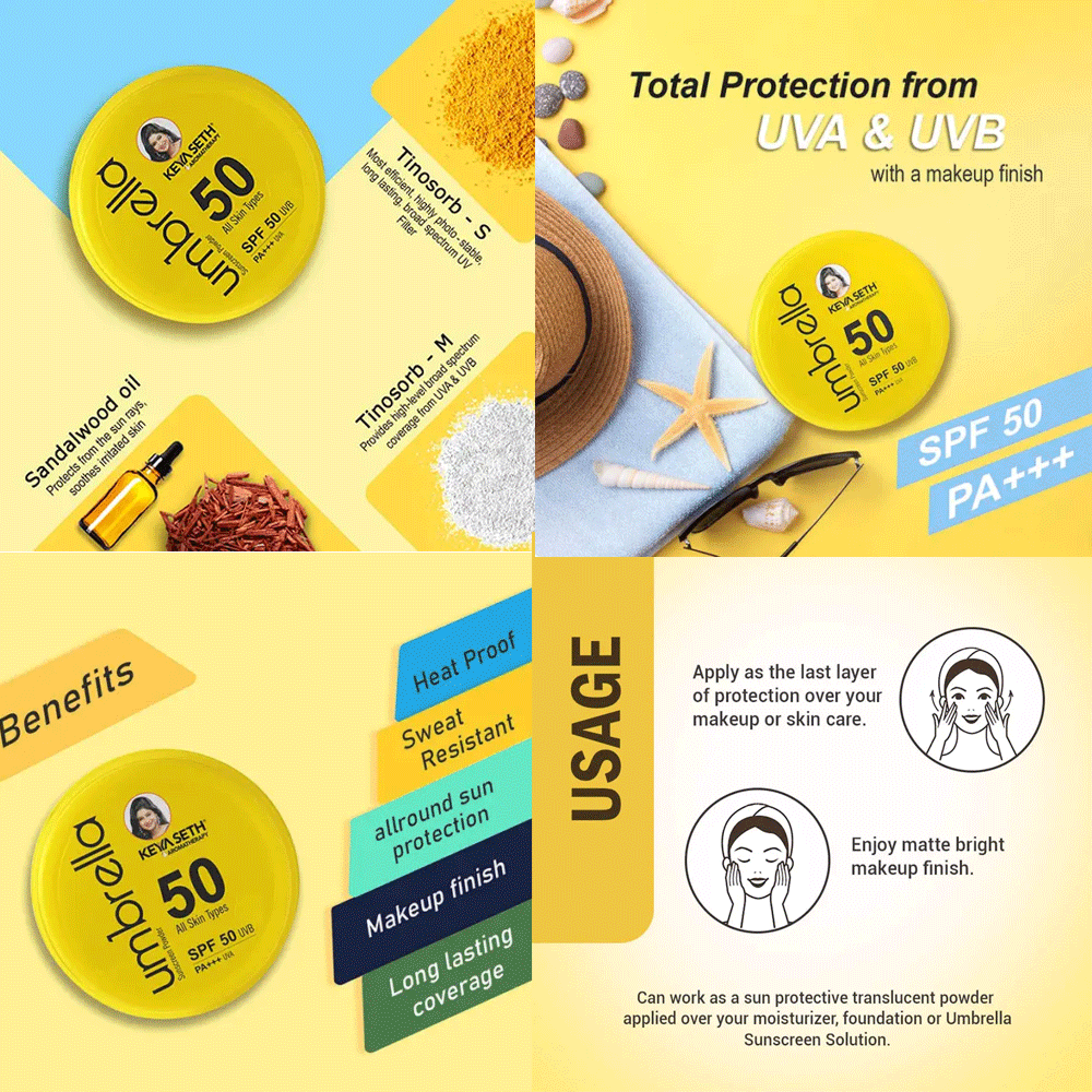 Buy Keya Seth Aromatherapy Umbrella SPF 50 Sunscreen Powder 50g online in Bangladesh from Cellsii. Keya Seth Aromatherapy Umbrella SPF 50 Sunscreen Powder is a mineral-based sunscreen that offers broad-spectrum protection against both UVA and UVB rays. The powder format makes it ideal for on-the-go application and can be easily applied over makeup. It is formulated to be lightweight, non-greasy, and suitable for all skin types.
